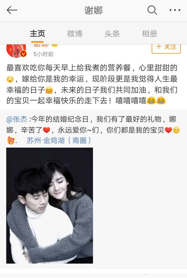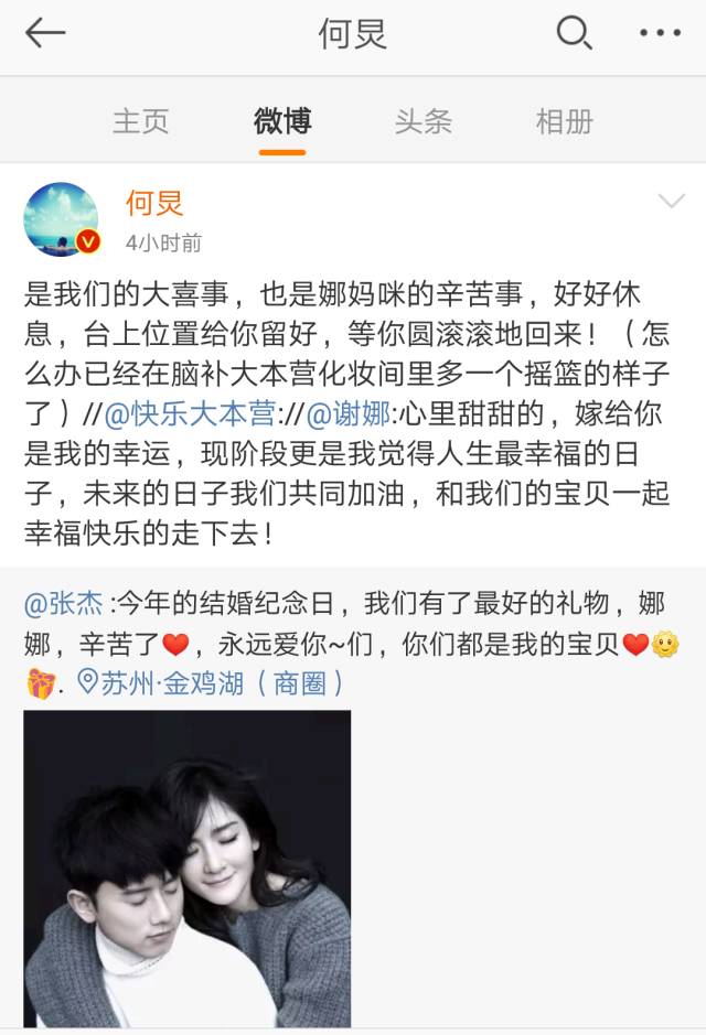 今天上午,张杰微博发文:今年的结婚纪念日,我们有了最好的礼物,娜娜辛苦了,永远爱你~们,你们都是我的宝贝。随后谢娜转发,坐实怀孕的传言。