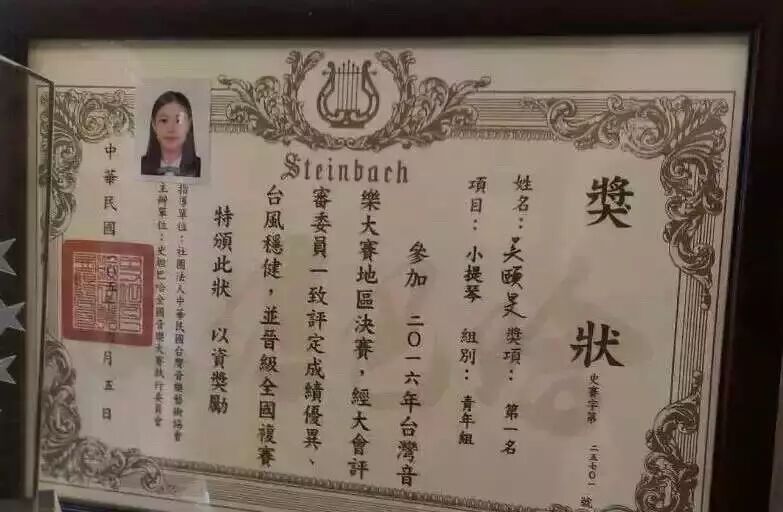荣获“台湾史坦哈音乐大赛青年组第一名”