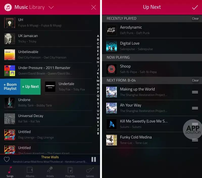 AppSo(微信号 appsolution)提醒,Boom 的主色调为桃红,应用暂不支持自由换肤。像 App Store 上的众多播放器一样,Boom 仅能读取本地曲库,播放通过 iTunes 同步的歌曲。