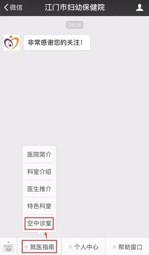 方式四:关注“江门市妇幼保健院”官方微信(jmsfybjy),点击底部菜单“就医指南”里的“空中诊室”,即可参与互动。