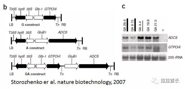 第三、转基因高叶酸大米的研发。比利时根特大学的Dominique Van Der Straeten教授领衔的团队利用转基因技术分别创制了含有来自模式植物拟南芥菜的 GTPCHI、ADCS和同时含有这两个基因的三种转基因水稻,分别命名为G水稻、A水稻和GA水稻(图3)。