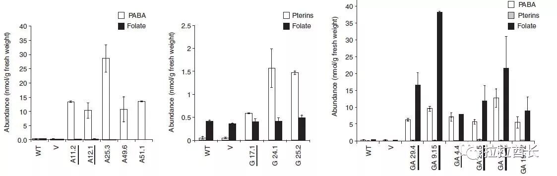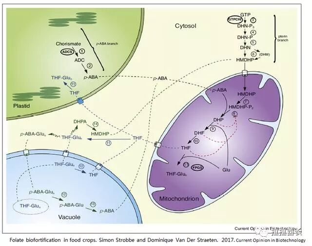 其次,叶酸的在植物细胞里合成途径特别复杂,其结构的三个部分分别在三个位置合成,蝶啶在细胞质合成、p-ABA在质体里合成,而后两者都转运到线粒体合成叶酸并加上不同长度的多聚谷氨酸尾巴(图2)。