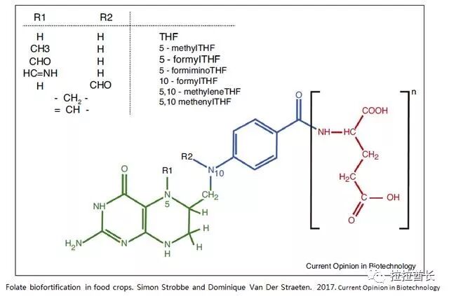 首先,看一下叶酸的结构,这个很重要,这决定你吃的叶酸的种类是否有效是否有利于你吸收。叶酸建安来说分三个部分,如图1绿色部分的蝶啶、蓝色部分的对氨基苯甲酸(p-ABA)和红色部分的多聚谷氨酸尾巴,这个谷氨酸尾巴的越短的叶酸越有利于人体吸收。不同种类的叶酸就是以N5或N10上面基团(R1/R2代表不同的基团)不同为区分。