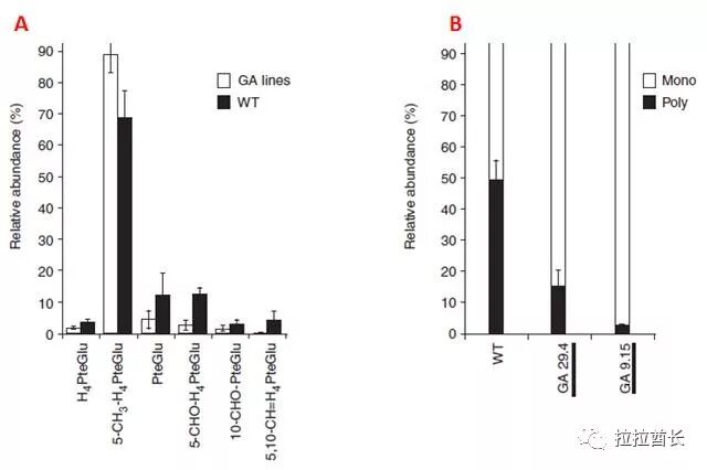 图5.A图中白柱子是5甲基4氢叶酸的含量。B图中黑色的柱子代表多聚谷氨酸尾巴长的叶酸含量