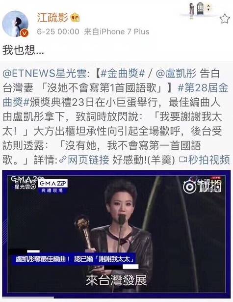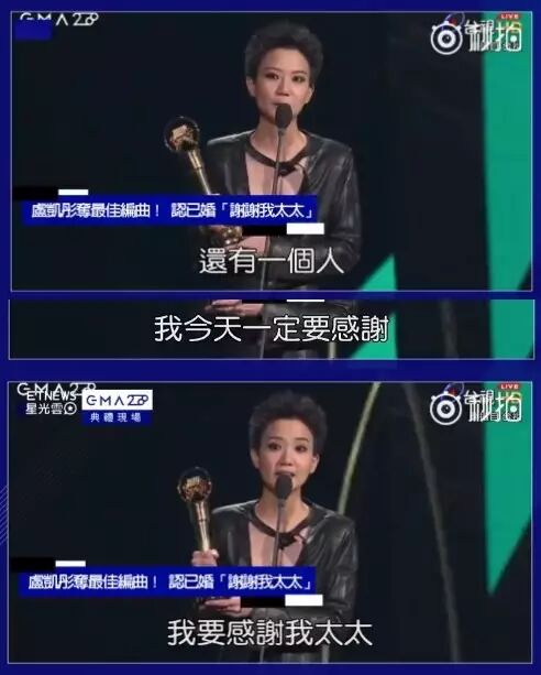 在台湾金曲奖的颁奖典礼上,获得了编曲人奖项的卢凯彤说: