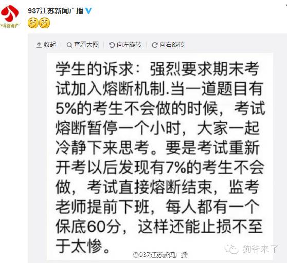 当一道题目有5%的考生不会做的时候,考试熔断暂停一个小时,大家一起冷静下来思考。要是考试重新开考以后发现有7%的考生不会做,考试直接熔断结束,监考老师提前下班,每人都有一个保底60分,这样还能止损不至于太惨。
