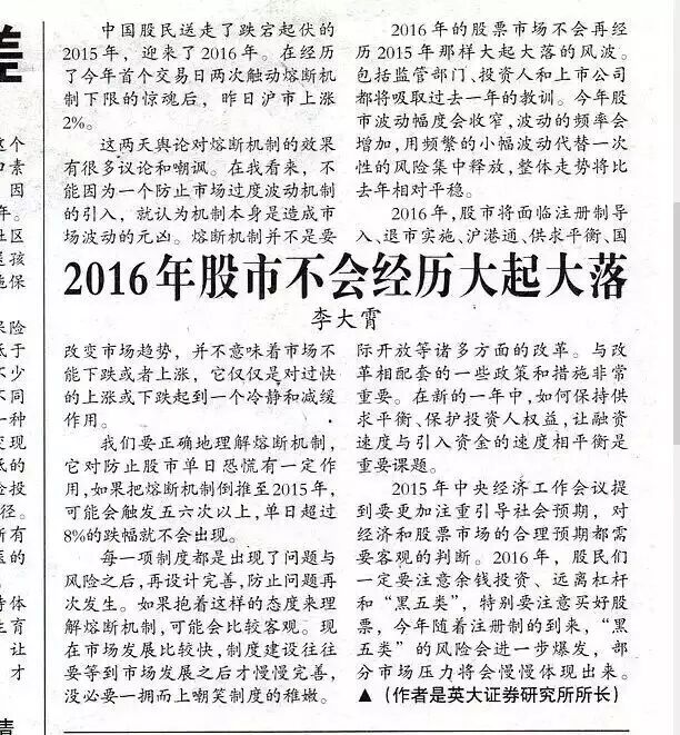 >Hans:新华社前天发文《A股熔断不会是常态》。业内权威解读:单双日限熔。