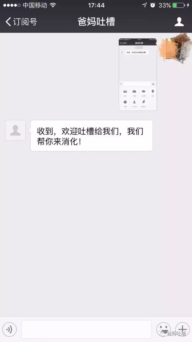 爸妈营新开了一个号,叫【爸妈吐槽】,微信号:bamatucao,欢迎大家关注,我们专注爸妈吐槽,每天po最新匿名吐槽,也让更多的爸妈们给吐槽者一些建议和意见。