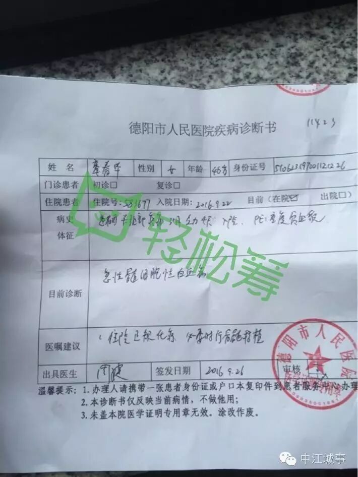 求助者叫邹东梅,是一位怀孕妈妈,是章春华的大女儿,如今母亲在2016年9月22日在德阳市人民医院确诊为急性白血病,现今在德阳市人民医院血液科47床进行化疗,由于我的母亲十分虚弱,只能由我这位怀孕在身的女儿替在病床上的母亲向社会爱心人士求助。
