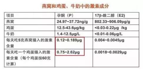 换句话说:如果按正常人每天吃一个鸡蛋(60克),以及每天吃5克燕窝计算,燕窝摄入的孕酮含量比鸡蛋要低很多,17β-雌二醇含量也和鸡蛋差不多。而燕窝中丰富的唾液酸有助于促进胎儿的大脑发育,EGF和胶原蛋白帮助预防妊娠纹,恢复皮肤紧致度。