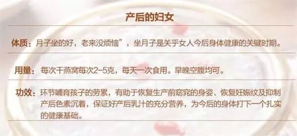 用量:此时进食燕窝时注意不要摄盐过多,建议早上食用燕窝,以免晚上等待空腹时间长引起疲劳。建议每次用干燕窝3-5克,每天或者隔天一次食用。