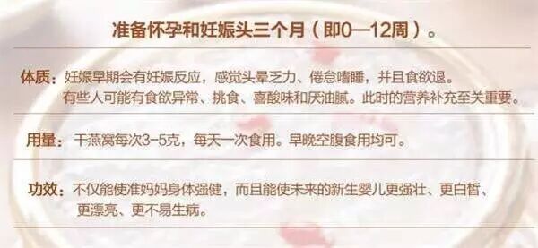 所以建议夫妻二人在备孕前2~3个月开始吃燕窝调理身体,有助于提高精子和卵子的质量,并且燕窝中的唾液酸能提高身体的抗病毒能力,增强免疫力,将身体调理到理想状态之后就可以着手备孕了。