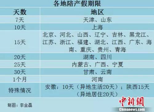 湖南、四川两地的陪产假为20天;内蒙古、广西、宁夏的陪产假为25天;安徽、陕西两地的陪产假根据夫妻是否异地生活而不同。安徽明确,男方享受10天护理假,夫妻异地生活的,护理假为20天;陕西规定,男方护理假为15天,夫妻异地居住的给予男方护理假20天。