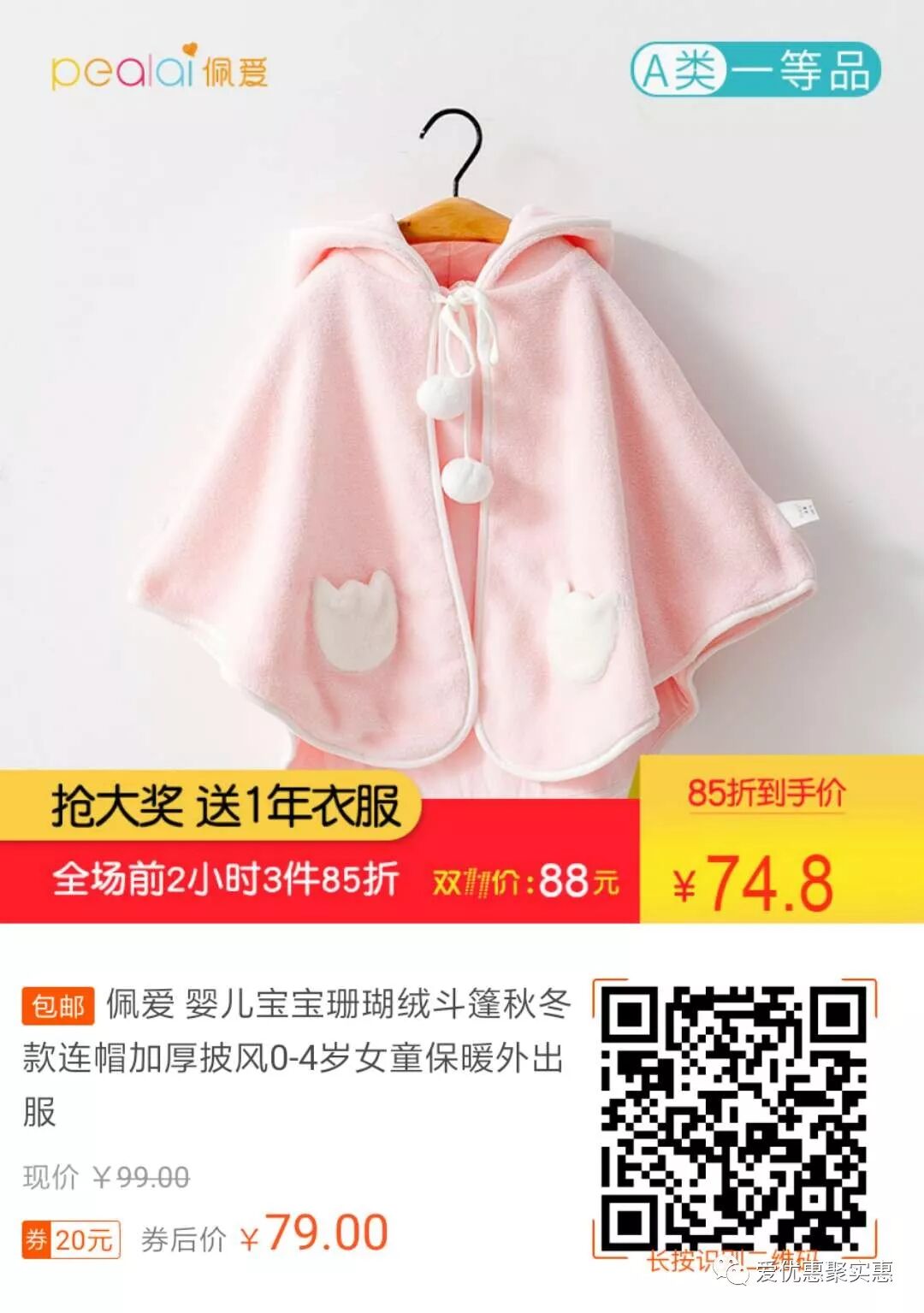 佩爱 婴儿宝宝珊瑚绒斗篷秋冬款连帽加厚披风0-4岁女童保暖外出服【包邮】