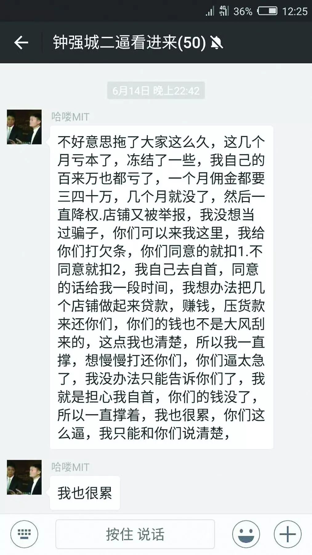 “今年4月中旬,我们逼他(钟强成)要钱,他说钱被淘宝冻结了。过了几天,他在群里说自己去淘宝总部谈判了,过半个月就可以拿到钱,让我们放心。”吴建兴说,听到钟强成说自己去找淘宝总部要求解冻,大家答应再等一段时间。