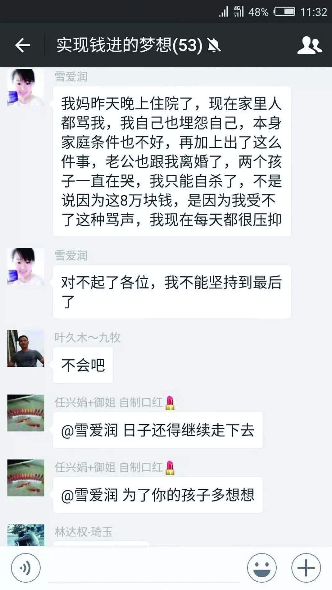 这是群里一位微信名叫“雪爱润”的群成员的微信截图,因其刷单的事情给家里的经济雪上加霜,不仅遭到自己母亲的责备,还被丈夫要求离婚,万念俱灰的她打算自杀。