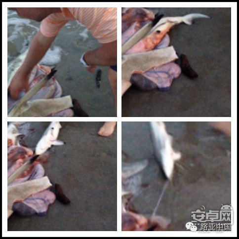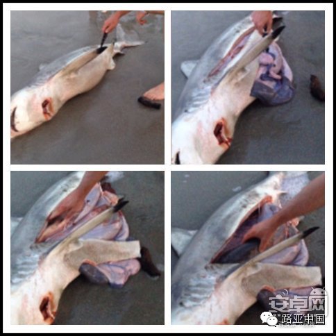 他们意识到可能是鲨鱼宝宝在里边,一名男子割开了鲨鱼肚子一探究竟,发现有三只小鲨鱼在里边(男子手上为第一只,上图)