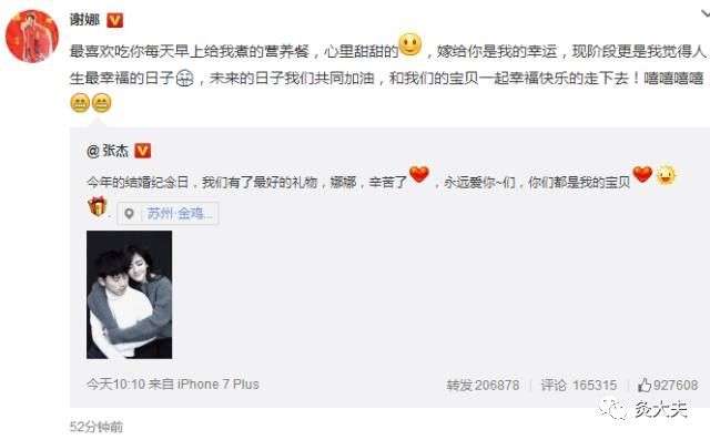 9月26日早上,张杰在微博上发文宣布谢娜怀孕,写道“今年的结婚纪念日,我们有了最好的礼物,娜娜,辛苦了。永远爱你~们,你们都是我的宝贝”。