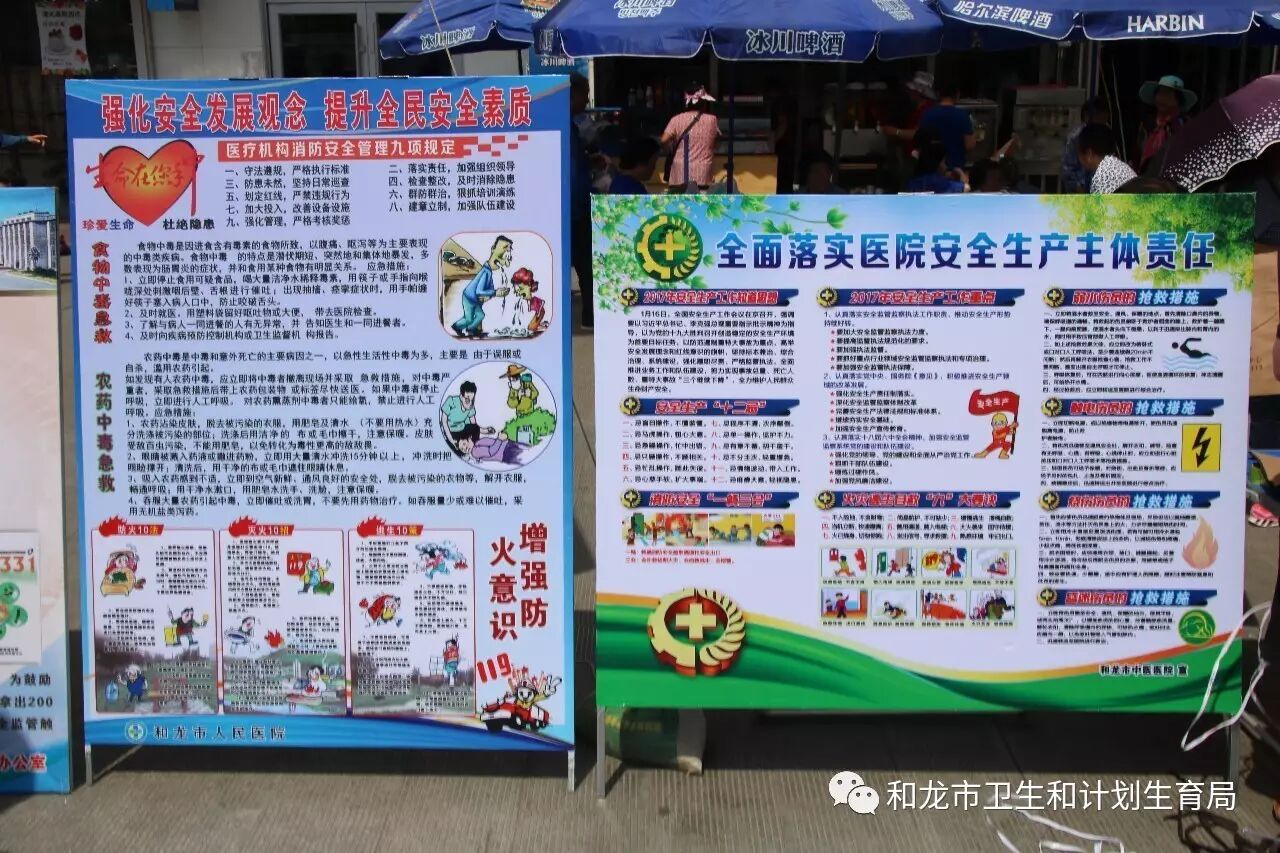 为深入学习贯彻党的十八届六中全会和习近平总书记、李克强总理关于安全生产工作的重要指示批示精神,以推动安全生产责任深化年各项工作任务为主线,普及安全知识,提升安全素养,全面系统排查整治安全隐患,凝聚弘扬安全发展理念、支持安全生产的共识,按照《关于和龙市2017年“安全生产咨询日”相关事宜的通知》要求,市卫生计生局组织市人民医院、市中医医院、市疾控中心、市妇幼计生服务中心开展了安全生产月宣传活动。