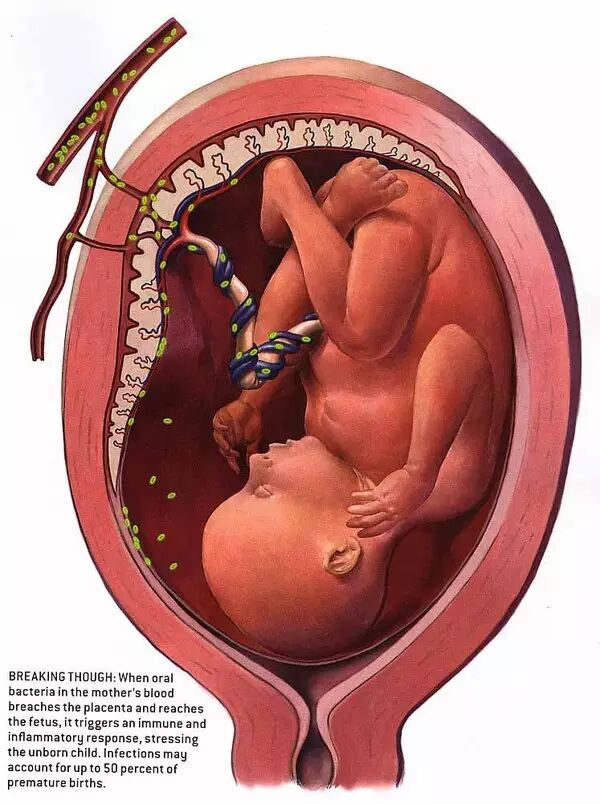 慢性口腔感染在孕妇体内造成的细菌感染和炎症的播散会导致不良妊娠结局如流产、早产和低出生体重儿的发生。因为当妈妈血液里面的细菌突破胎盘屏障,会引发免疫和炎症反应,给未出生的宝宝带来影响,而50% 以上的早产可能与感染有关。(见下图)