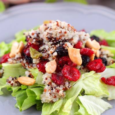 孕期藜麦沙拉 把藜麦、生菜、蔓越莓、蓝莓干、花生放入盘中,均匀地撒上橄榄油和沙拉酱,就可以好好享用了!