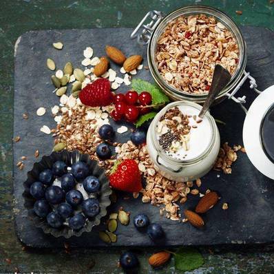 孕期什锦杂果酸奶 不同的坚果提供不同的营养,把不同种类的坚果(杏仁、巴西果、核桃仁、开心果等)和你喜欢的水果以及酸奶混在一起。