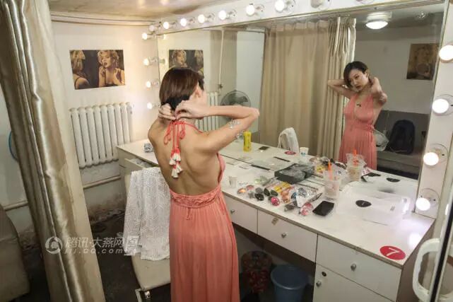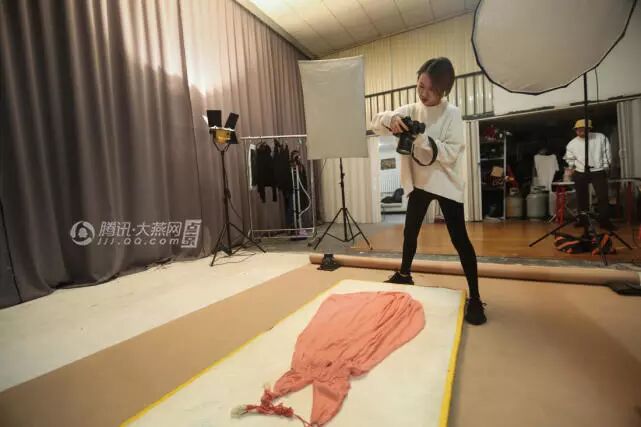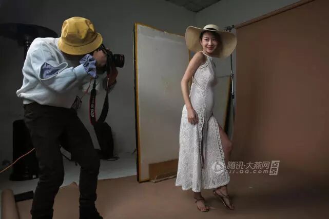 完成一件的拍摄后,露茜马上换上另一件纱质的长裙。这件衣服需要搭配的配饰很多,每一件分量都不轻。弯下腰穿绑带鞋时,她小心地扶着肚子,显得有些吃力。