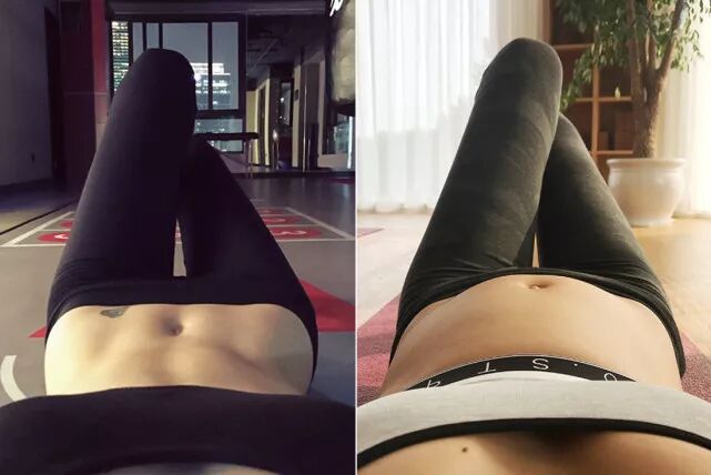 由于平时经常游泳、瑜伽,露茜的身材保持很好。图为露茜怀孕前后腹部的的变化。
