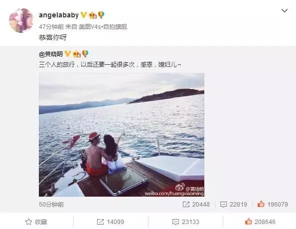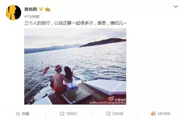 昨日,黄晓明在微博上晒出二人的度假照片,并称“三个人的旅行”。这也算是正式承认有了小baby吧。大baby随后转发并甜蜜表示“恭喜你呀”语气中透着甜蜜。单身汪表示收到了伤害,但还是愿意把最真挚的祝福都送给他们。