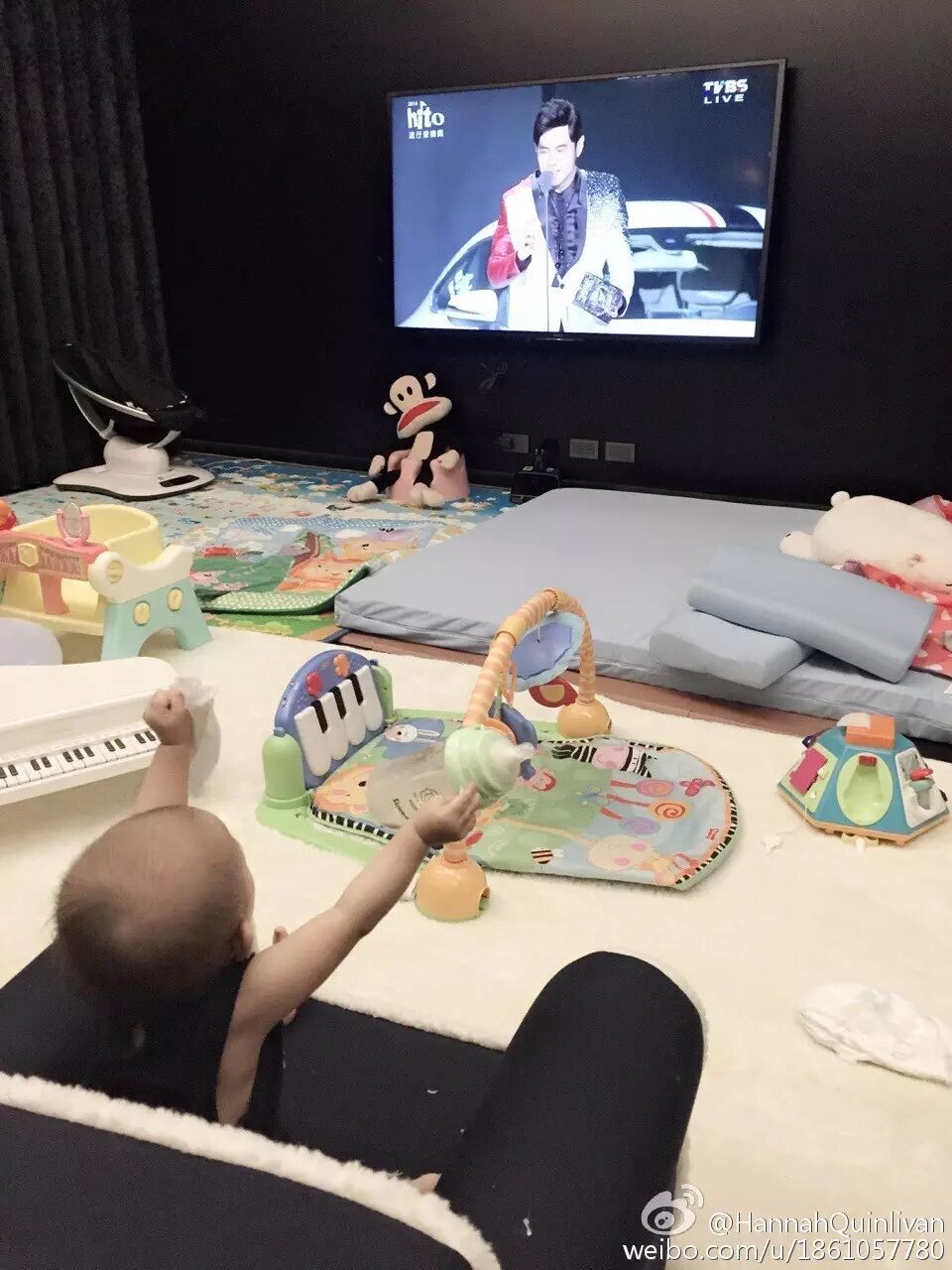小小周在看电视时,突然看到爸爸出现,特别激动。周董知道一定乐开了花吧。看小小周这挥舞的奶瓶,这是在要抱抱吗?