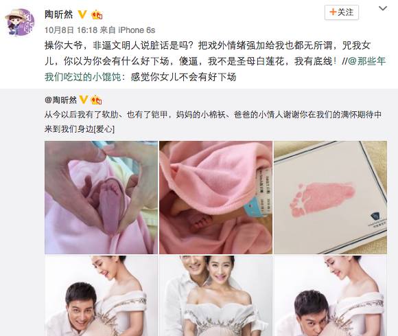 10月8日,陶欣然转发并回复一网友的“诅咒”当场开撕。网络暴力越来越可怕,但这竟然已经涉及到了刚出生还不到一个月的孩子身上。并没觉得陶欣然骂的过分,因为这涉及到了一个母亲的底线,一个绝对0容忍的底线。随着一些明星关闭评论,推出微博,网络暴力在无形中伤害着一些人,如今的言论自由绝对不是任何人伤害别人的武器,抨击他人时也请先换位思考。毕竟上个月发生的事情不想在任何一个公众人物身上重复上演,每一个公众人物甚至是每一位公民都值得被尊重。