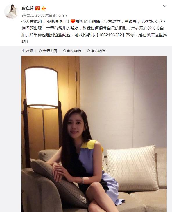 看来我们也应该好好向她学习,跟秋瓷炫一样美丽,有颜值,希望紫儿能够帮到大家。紫儿也是一个小仙女,但在护肤方向确实很厉害,很专业,微信:1062196282 (复制前面的数字,在微信添加,就可以找她帮助了)