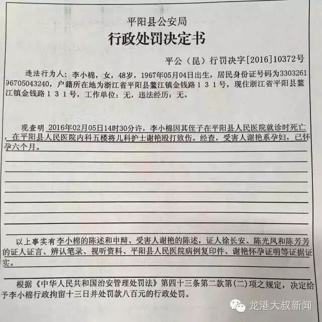 据平阳县当地论坛爆料:一5月大患儿因重症肺炎于2月4日上午入住平阳县人民医院,下午因病情急剧恶化抢救无效死亡,家属集结数十人打砸医院儿科病房,辱骂我们医务人员,并殴打一怀孕6个月的护士,边打边称“我的孩子没了,你的孩子也要一起陪葬!!"。该发帖者说道:医生是人不是神啊,没有起死回生的能力啊!