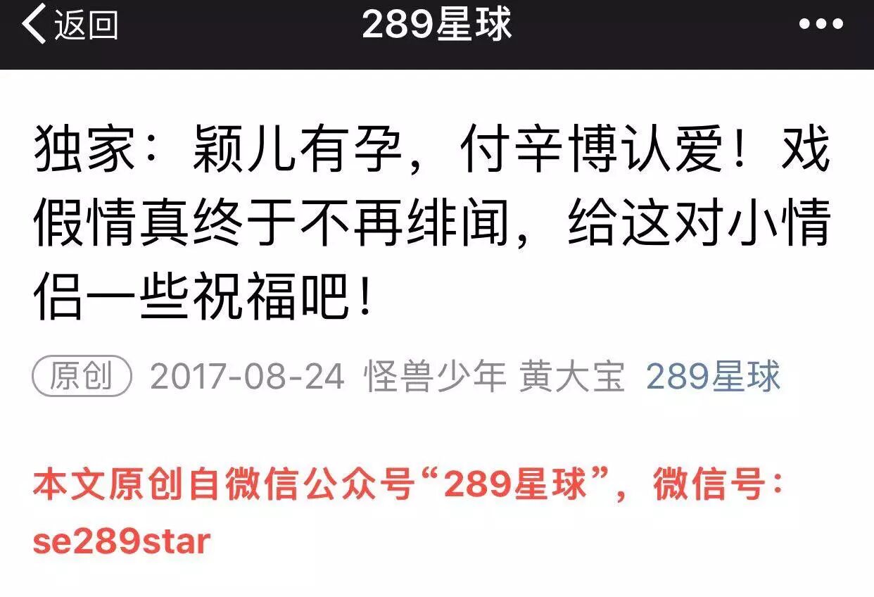 他还说颖儿怀孕他早就知道了,其实,《南都娱乐周刊》现在的微信公众号【289星球】,在今年8月24日颖儿付辛博认爱的当天,就已曝出颖儿怀孕的消息。