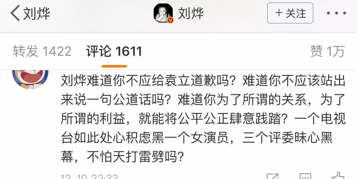 刘烨的微博下方评论是这样的。三位导师几乎都成了“众矢之的”。