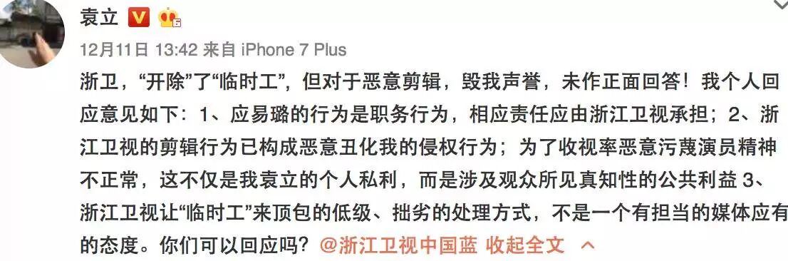 12月11日,又是早上7点多,袁立除了怒怼浙江卫视节目组,她还开始在网络上讨公道,要说法,要求浙江卫视向她道歉。