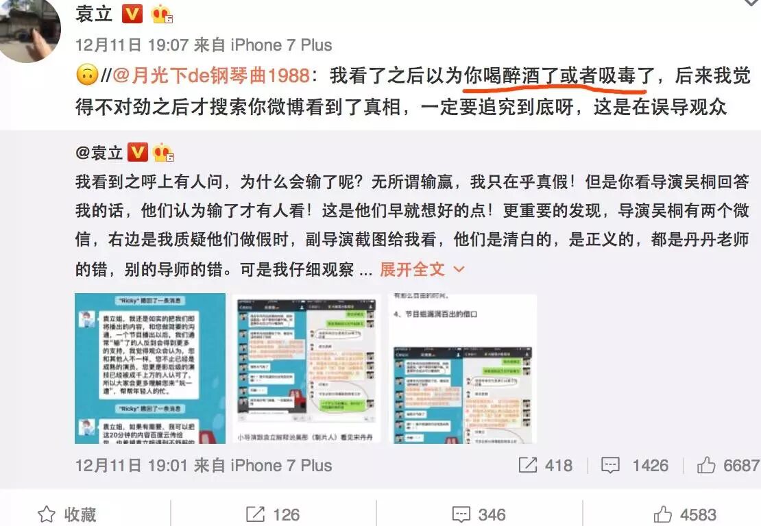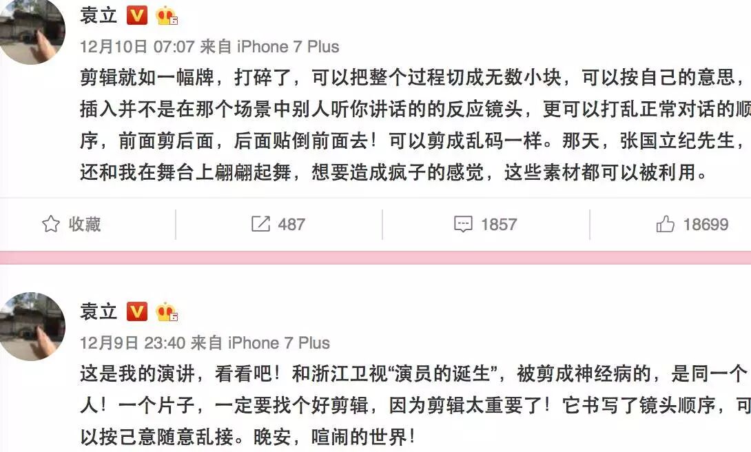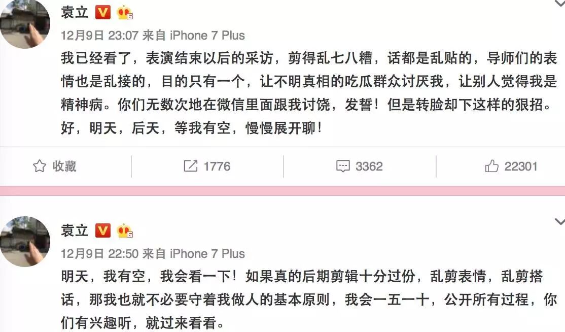12月9号22:50,她说,“明天我有空会看一下节目”。然而刚过十几分钟,袁立就发微博说自己已经看完了…… 讲真,这两段长微博编辑发送也要花一点时间吧?