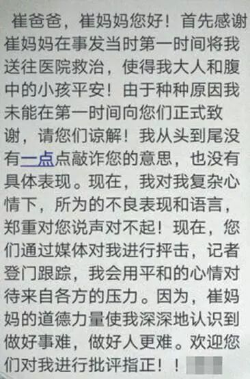 8日下午,在记者采访过刘老师后,她给崔先生发了一条短信:“崔爸爸,崔妈妈您好!首先感谢崔妈妈在事发当时第一时间将我送往医院救治,使得我大人和腹中的小孩平安!……现在,我对我复杂心情下,所为(有)的不良表现和语言,郑重对您说声对不起!现在,您(们)通过媒体对我进行抨击,记者登门跟踪,我会用平和的心情对待来自各方的压力。因为,崔妈妈的道德力量使我深深地认识到做好事难,做好人更难。欢迎您(们)对我进行批评指正!!”