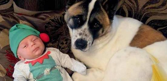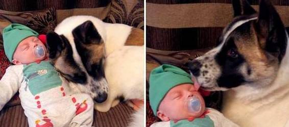 孩子的到来,狗狗主动担起了保姆的角色,它很喜欢这个弟弟,并一直守护着他。