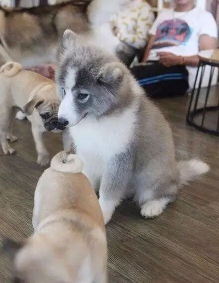 小狗狗的体型、毛发、脸型都随妈妈,长得像萨摩耶,但是这颜色嘛,就让主人比较纠结了。看了小狗狗的颜色,主人锁定了几个疑凶,分别是阿拉斯加、二哈、边牧……