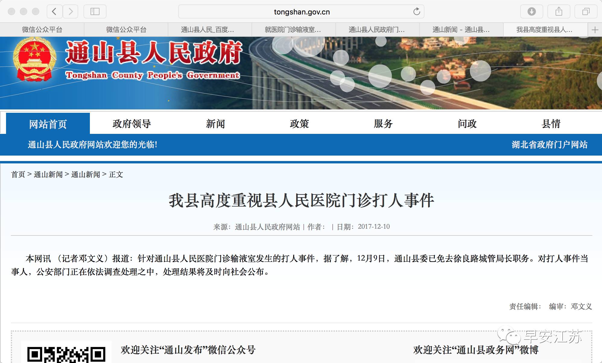 针对通山县人民医院门诊输液室发生的打人事件,据了解,12月9日,通山县委已免去徐良路城管局长职务。对打人事件当事人,公安部门正在依法调查处理之中,处理结果将及时向社会公布。