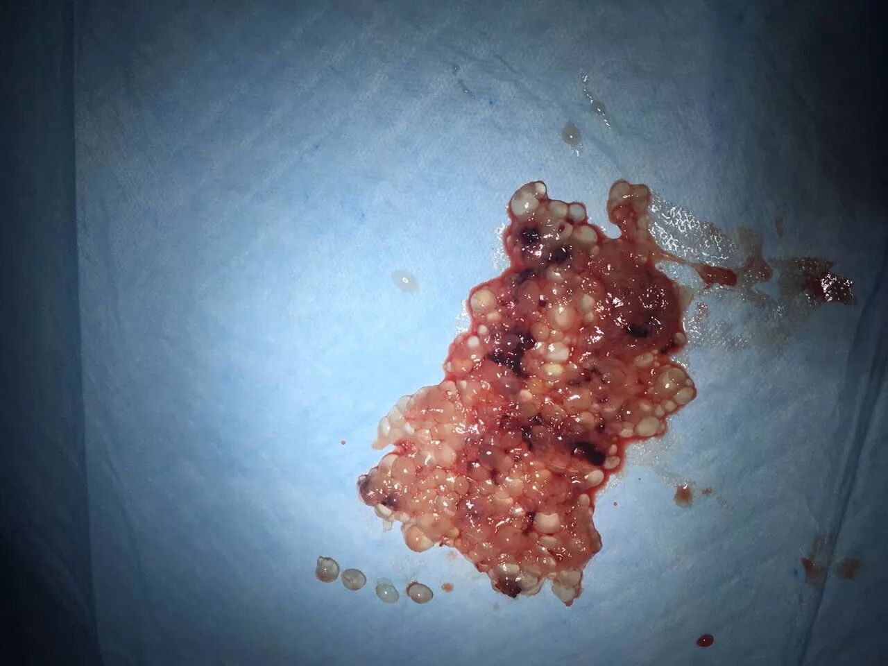 很快,依萍在医院接受了刮宫手术,手术顺利,出血不多。刮出组织内完全是一串串的小水泡,是非常典型的葡萄胎。但徐医师强调,“葡萄胎病人不是刮宫完就治疗结束了,术后需要定期监测血HCG指标,观察是否下降理想;此外,还需要B超复查,如出现宫内组织残留,还需要再次清宫;葡萄胎病人约有半数左右病人可能需要再次清宫。”