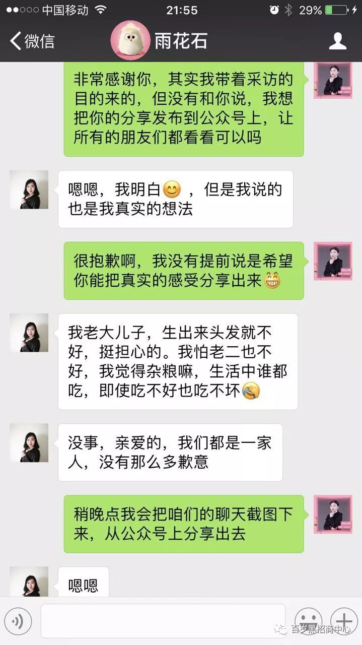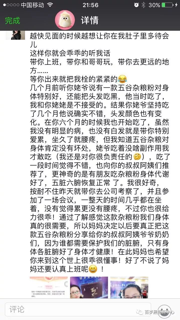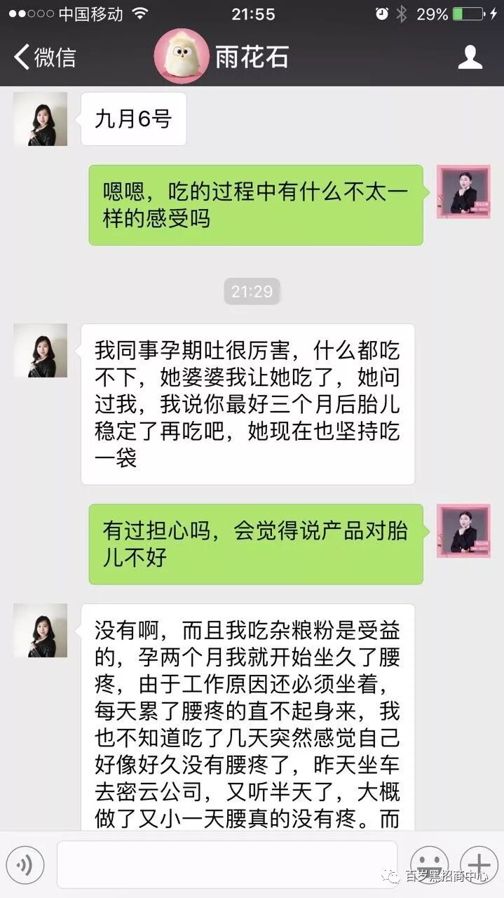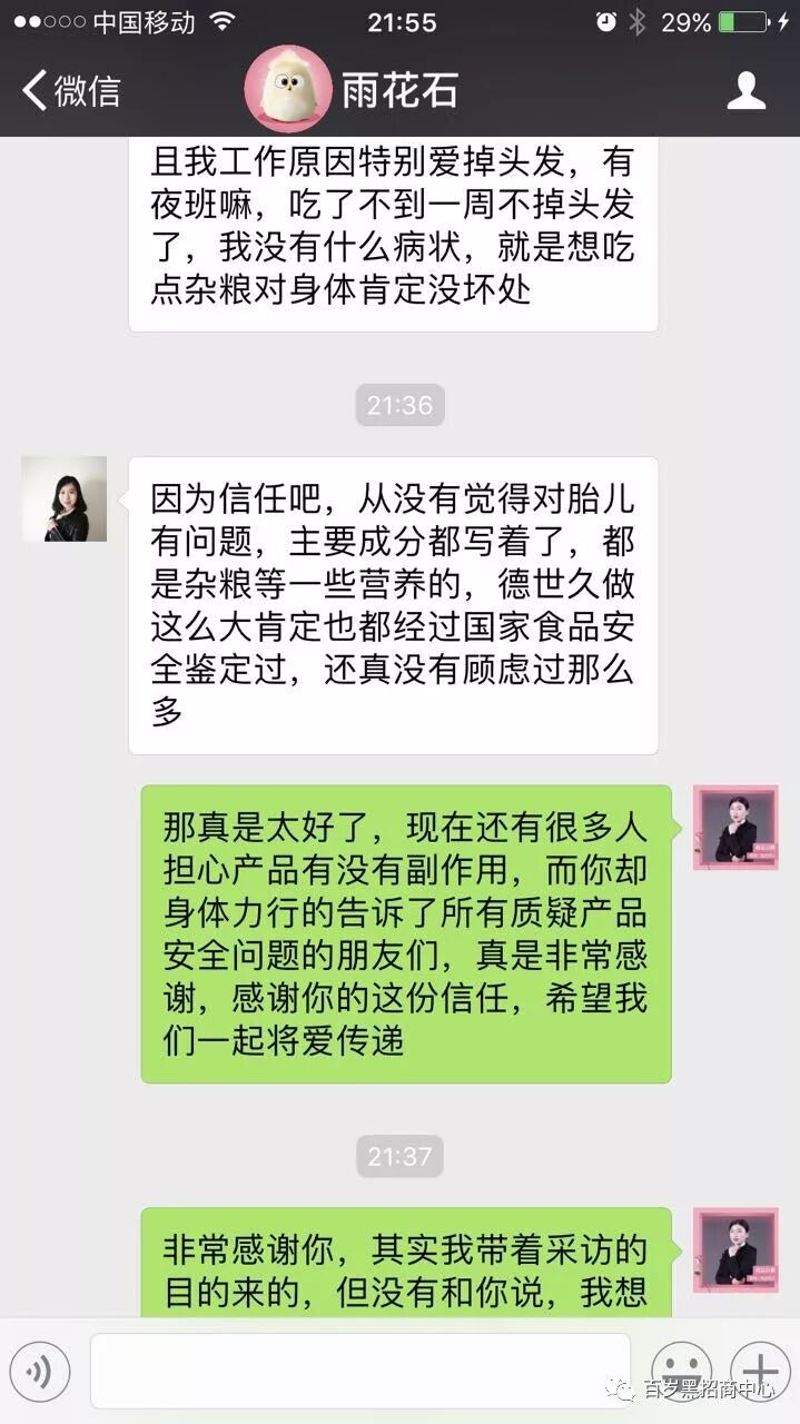 今天认识了一位朋友,也是咱们德世久唐山的一名会员,一位怀孕8个月的妈妈,刚加上我就去她的朋友圈看了看,发现她是一位怀孕的妈妈,而且在坚持着吃德世久杂粮粉,所以就很好奇,为什么这样说,其实在以前与新朋友的沟通过程中,我们一般都会建议孕妇不要吃,因为孕妇的体质毕竟比我们娇贵一些,所以不太建议她们来吃,今天看到这位会员朋友在朋友圈的分享就非常好奇,特别想要知道她是怎么决定在怀孕期间也吃这款杂粮粉的,一整天都在想着,能不能向她采访下她的感受,白天没聊上几句,就在刚刚和她聊上,一开始我并没有告诉她想要采访下她,是想要她能够真实的表达自己的感受,而不是为了宣传,在聊天结束的时候,我征求了她的意见,我说我想把这段分享截图下来,给那些还在担心产品安不安全的朋友们看看,希望让更多的朋友能够放心的吃上这款产品,有的时候傻傻呼呼简简单单相信就行了,想的越多反而失去的就越多,下面我就把我们的聊天截图分享给大家!