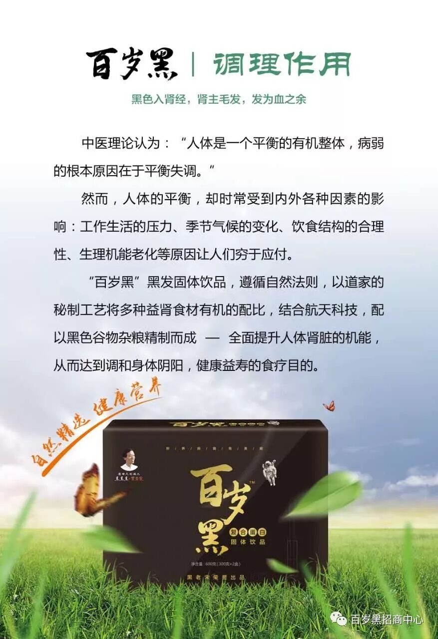 现代医学认为:“黑色食品”不但营养丰富,且多有补肾、防衰老、保健益寿、防病治病、乌发美容等独特功效。百岁黑由北京神飞航天应用技术研究院航天专家团队精心研发,原料经过航天优选,结合中国传统营养食疗理论,科学配比,营养均衡,能够满足现代人的营养需求,是符合宇航食品要求的优质“黑色食品”。