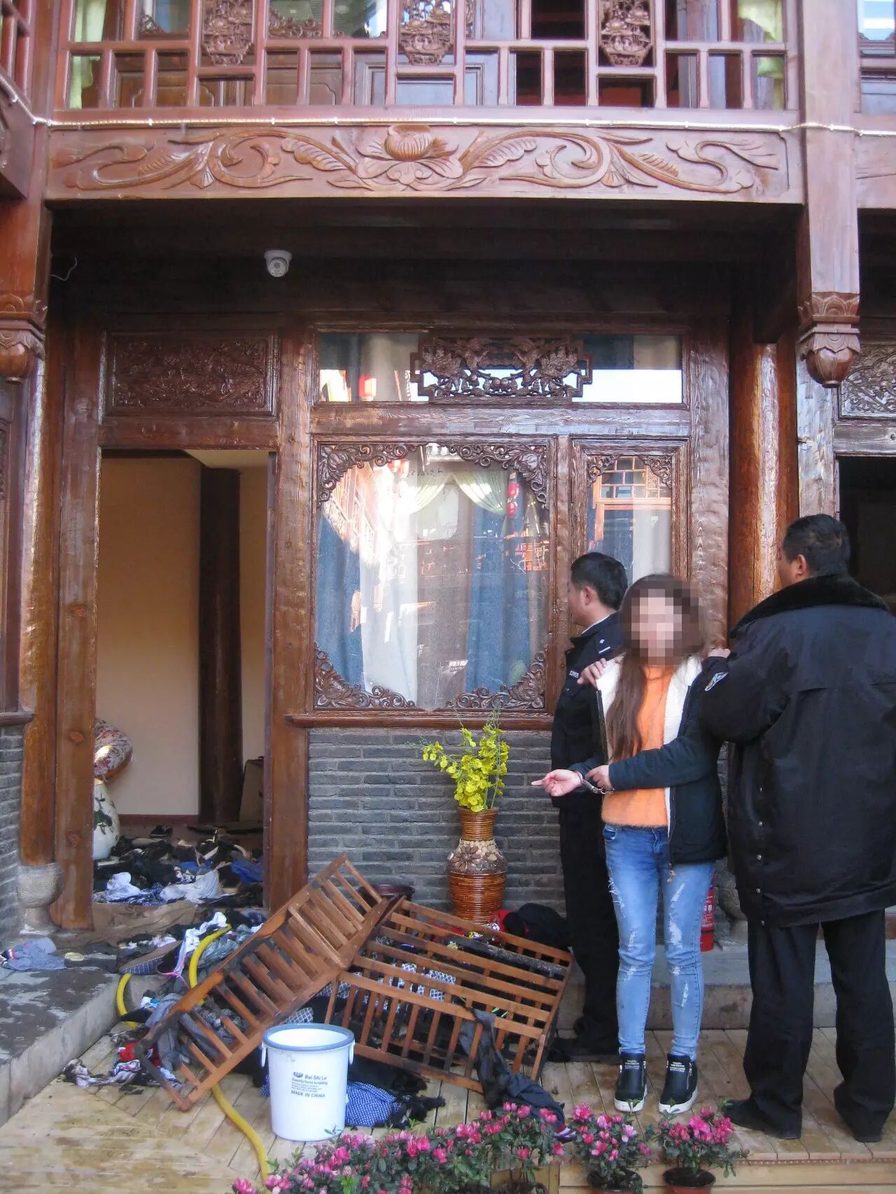凌晨1时20分许,丽江市公安局古城分局古城派出所接到报警称有人在烧房子。民警赶到现场时,房间里的明火已基本被古城消防中队以及古城志愿消防队的工作人员扑灭,但房间里烟雾仍冲得很高,房间外,一名年轻女子被不少人团团围住。