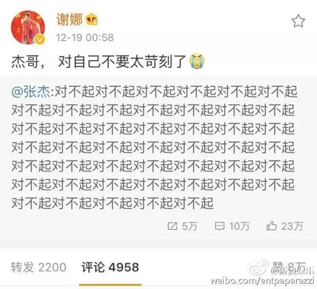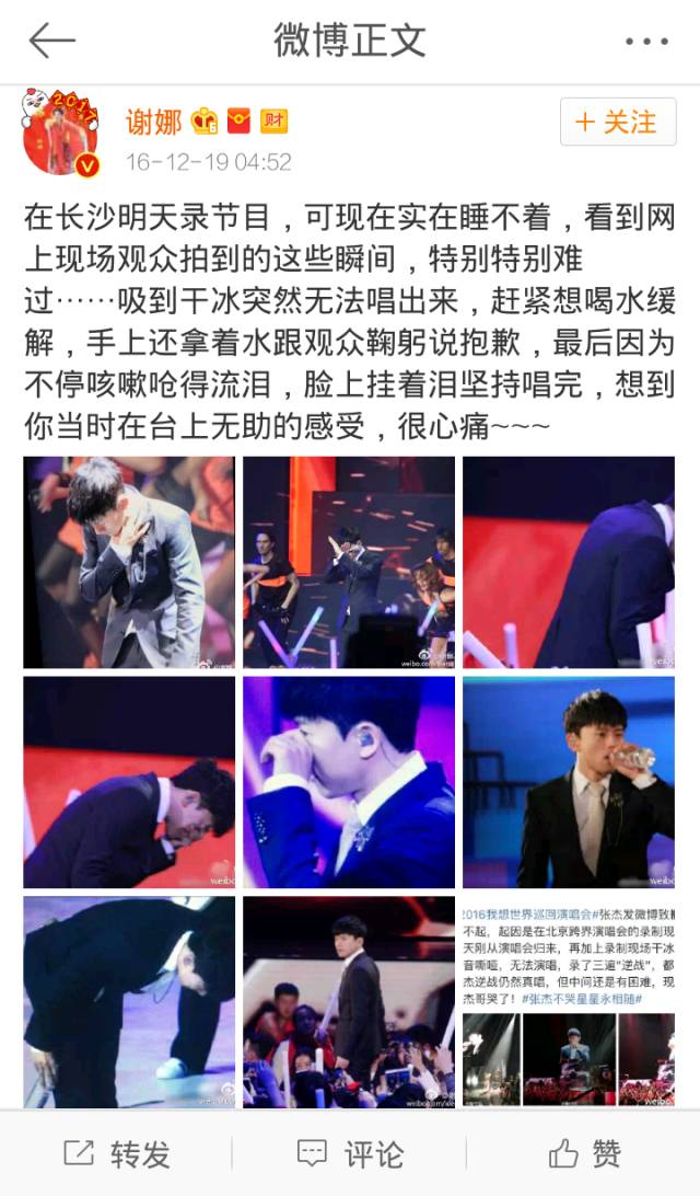 当时得知这个消息的谢娜第一时间心疼转发微博,并说:“杰哥,对自己不要太苛刻了。”