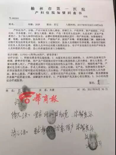 9月4日下午,在家属签字的《产妇住院知情同意书》上,记者看到,产妇马某、其丈夫延某分别在该同意书上签字并按了手印,同时其丈夫延某在后面写有: