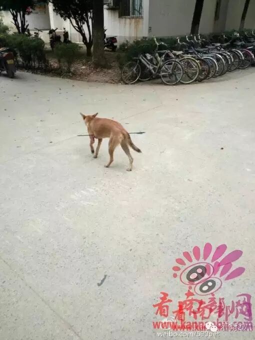 8月24日,华中科技大学校园内一只流浪狗腹部被箭射穿。