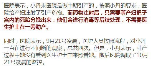 小丹说,医生先是给自己注射了引产药物,然后就离开了。后来,孩子就从她身上掉了下来。当时她心里很害怕,由于医院规定亲友不能进入病房,身边一个人也没有。之后,小丹说她多次呼叫医生都没有得到回应,后来还是医院的保洁阿姨发现她生了孩子,才喊了医生过来。