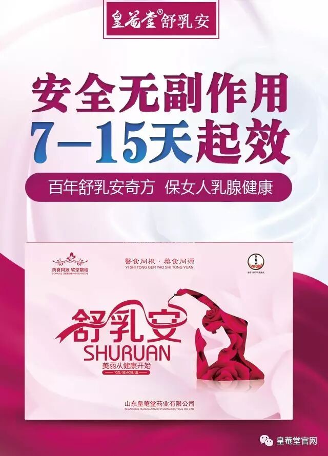 皇菴堂舒乳安,产品采用精选平卧菊三七、 内金、人参、丁香、 阿胶、 白芷 、佛手、乌梅、等30多味名贵草本精华萃取,通过最新科技提纯制剂技术精制,不仅安全无毒副作用,且效果大大提升。皇菴堂舒乳安通过活性分子,在膻中、屋翳、穴形成能量冲击。其效能够直入脉络,激活乳腺细胞活性,改善人体微循环,加速受损乳腺组织修复,活经镇痛,软坚散结,加速新陈代谢,促进病变部位毒素排出,改善病变部位血液循环,消除肿块疼痛,从而加速患病部位的康复,最终解决乳腺问题不复发。